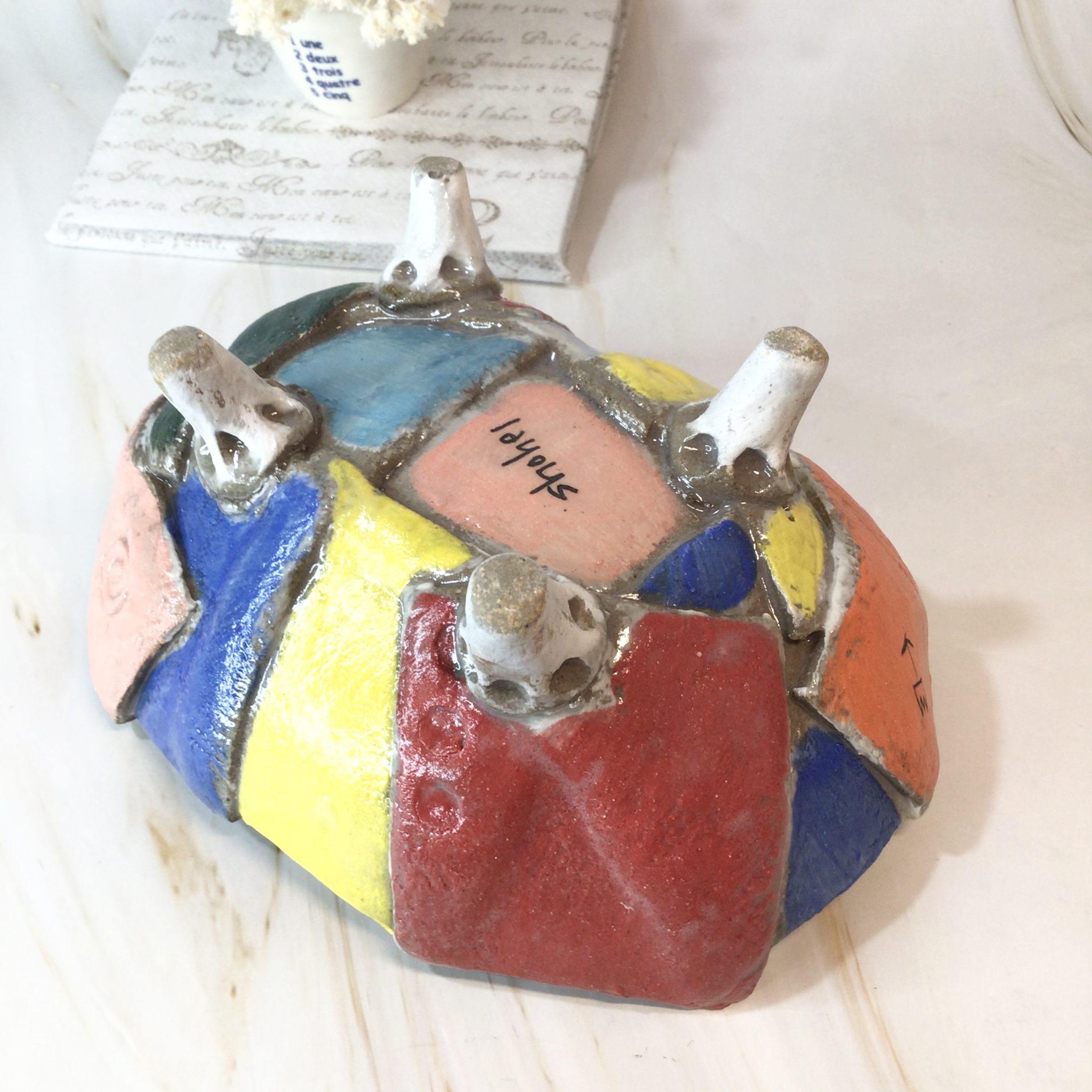 華やかな色の組み合わせの貼り貼り鉢です。
