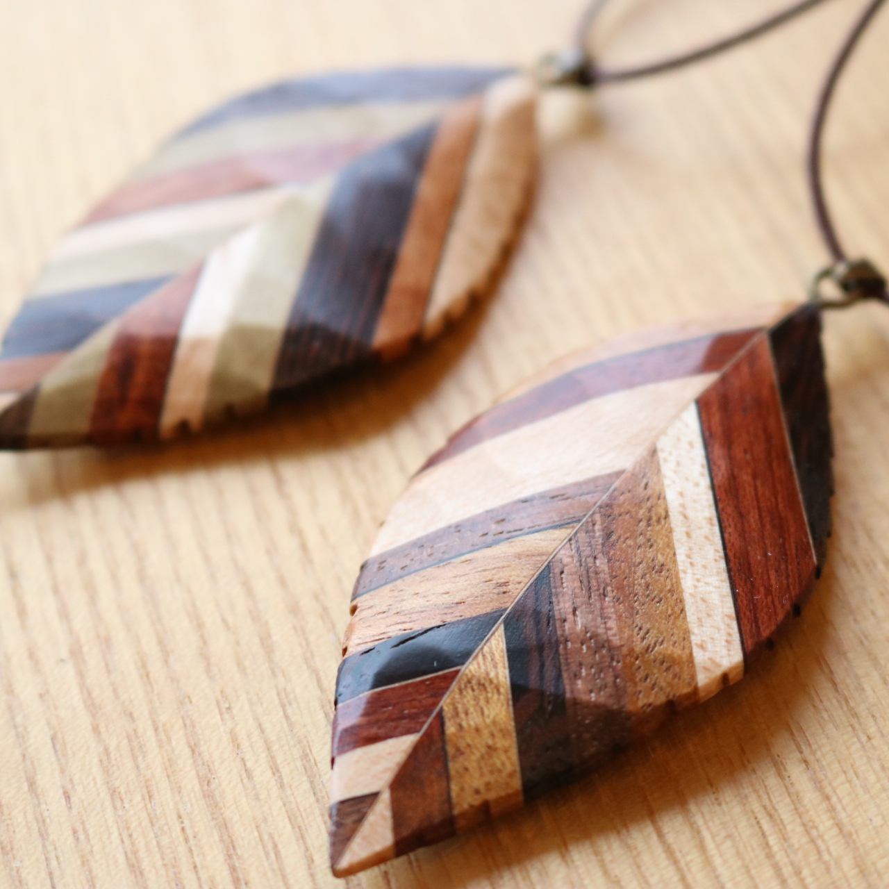 寄木で作った木材のアクセサリー。
