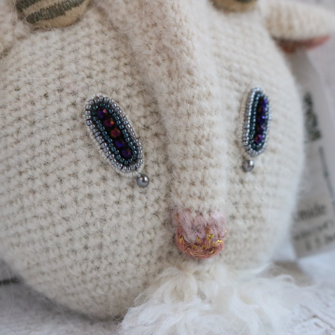 優しい色合いの編み地に、動物の愛らしい表情がポイント。