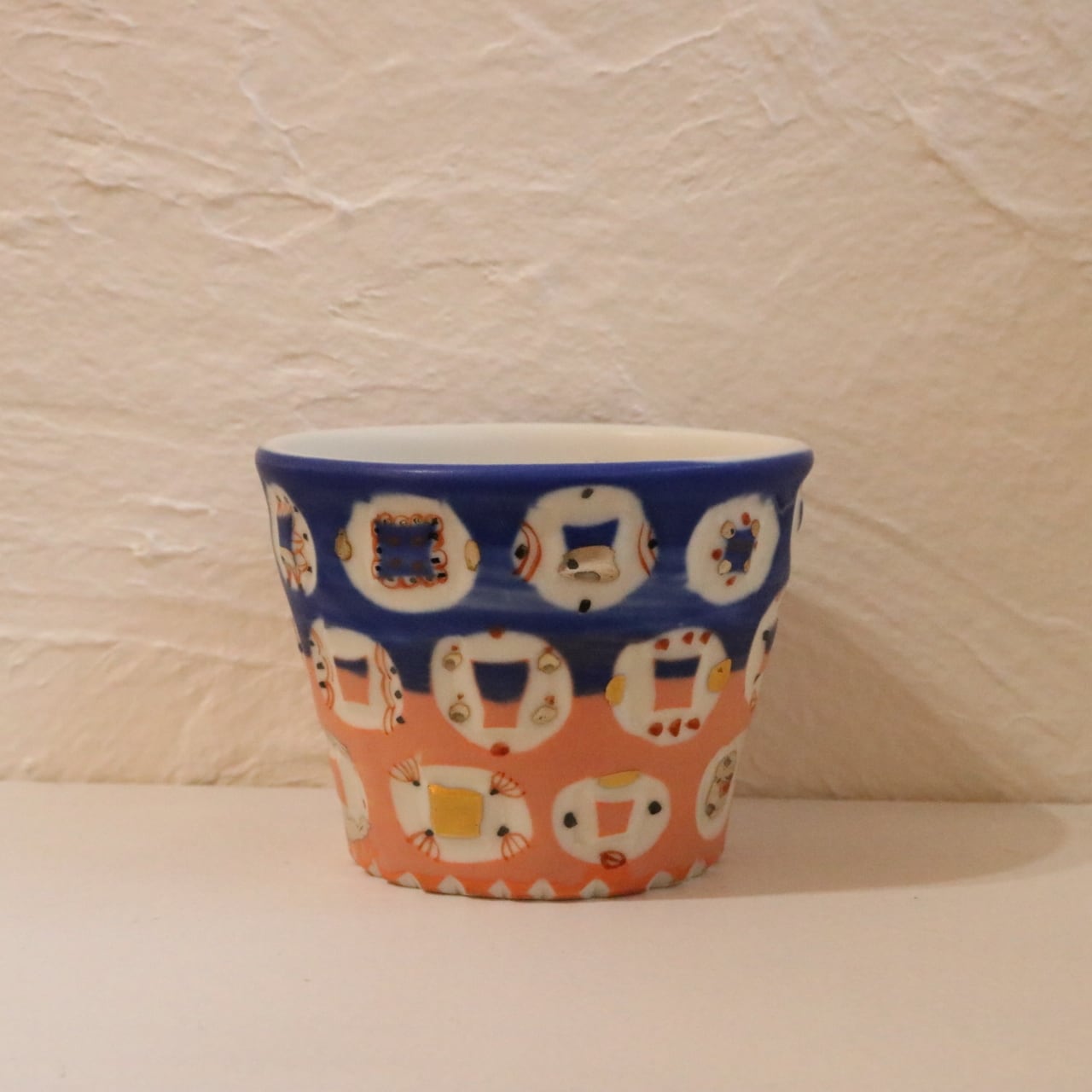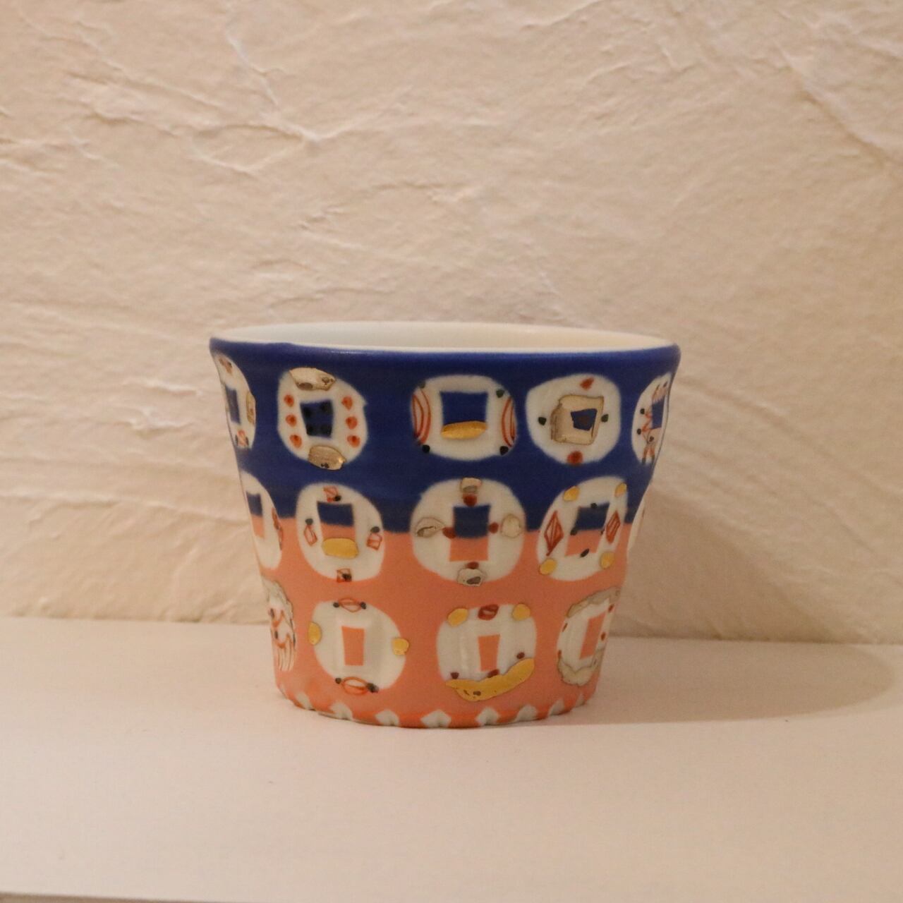 浜坂尚子の色鮮やかな手彫りの作品の蕎麦猪口です。
