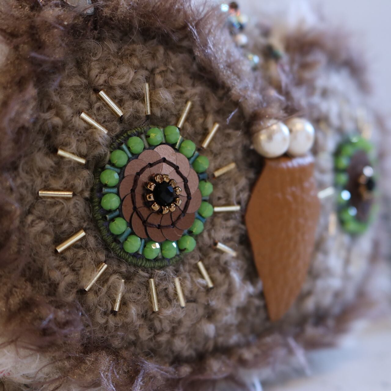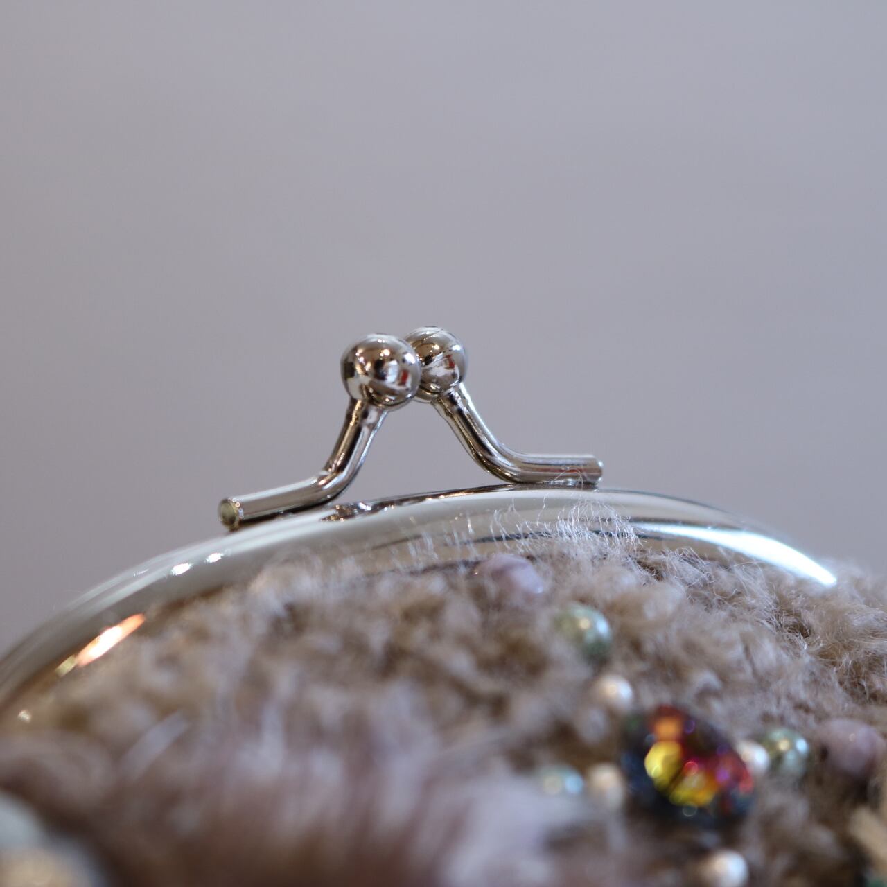 手編みのかぎ編みで丁寧に作られたポーチはふんわりとした風合いが特徴です。また、ビーズを使い、立体的に仕上げられたネ顔は存在感があり、周りの目を引きます。
