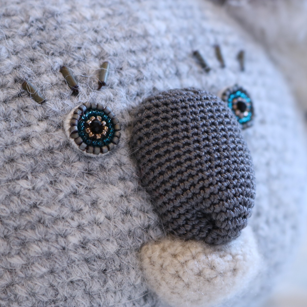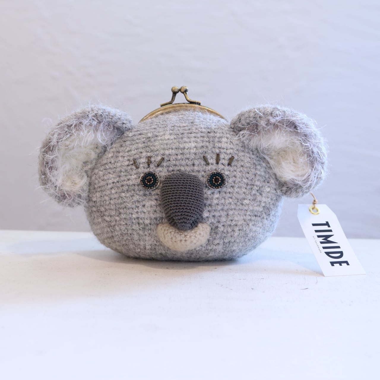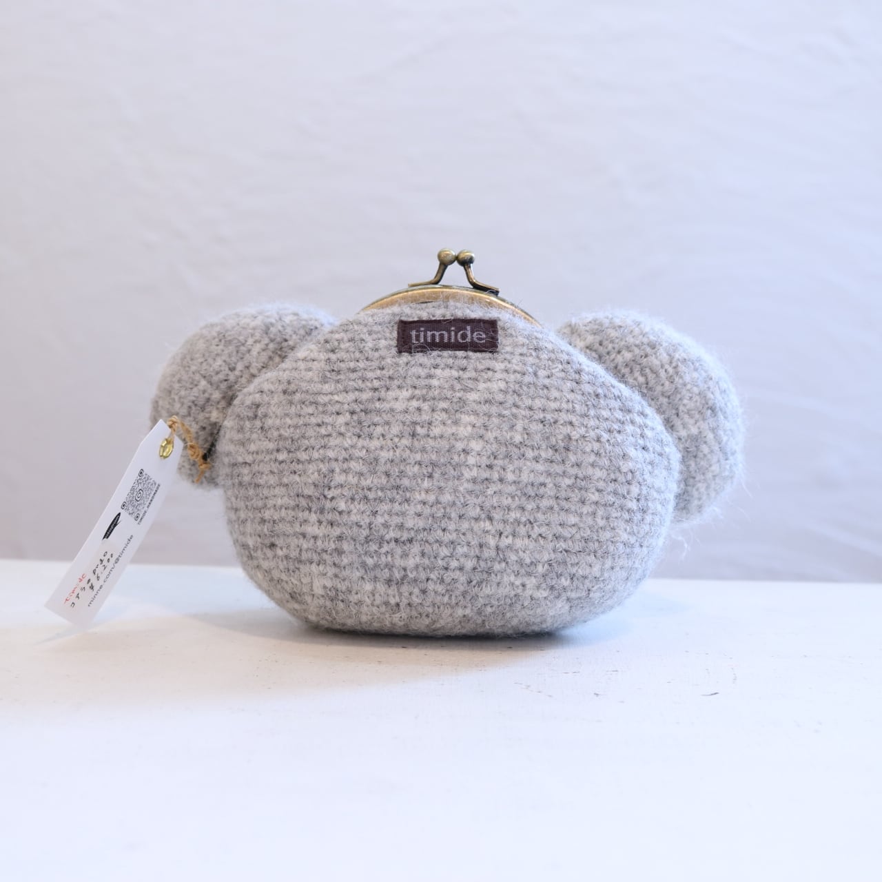 手編みのかぎ編みで丁寧に作られたポーチはふんわりとした風合いが特徴です。また、ビーズを使い、立体的に仕上げられたネ顔は存在感があり、周りの目を引きます。