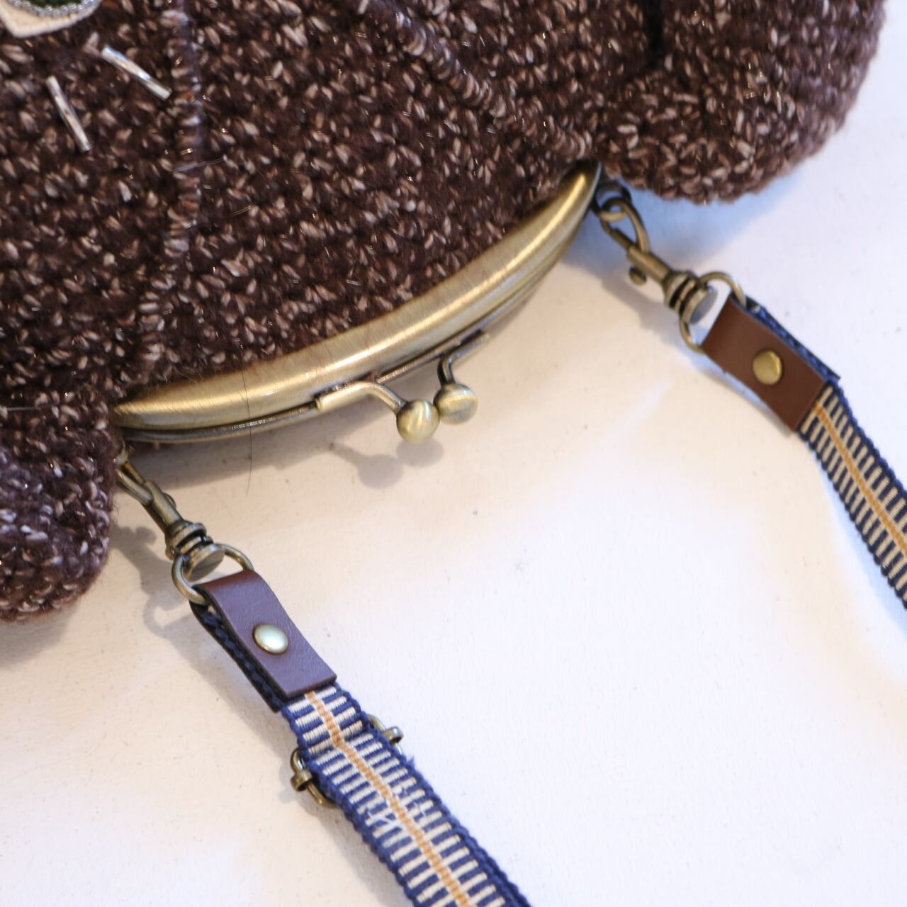 手編みのかぎ編みで丁寧に作られたポーチはふんわりとした風合いが特徴です。また、ビーズを使い、立体的に仕上げられたネ顔は存在感があり、周りの目を引きます。